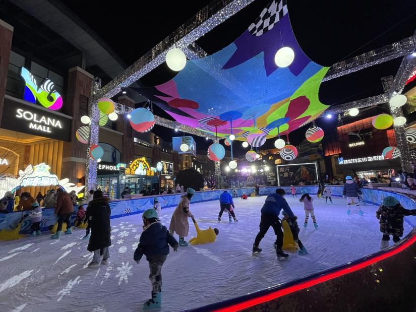 走进跳跳泉广场,六个相互连接的“手风琴”拱门吸引着人们的目光。孩子们在每座拱门底部的交互式触控板上蹦蹦跳跳,“手风琴”便奏响美妙旋律,音乐、色彩和光影的巧妙融合让人们赞叹不已。旁边的冰冻星球溜冰场上,孩子们伴随着音乐欢快地在冰上起舞,小脸被风吹得通红。场外的家长们纷纷举起相机,记录着孩子们这场流光溢彩的冬日梦境。