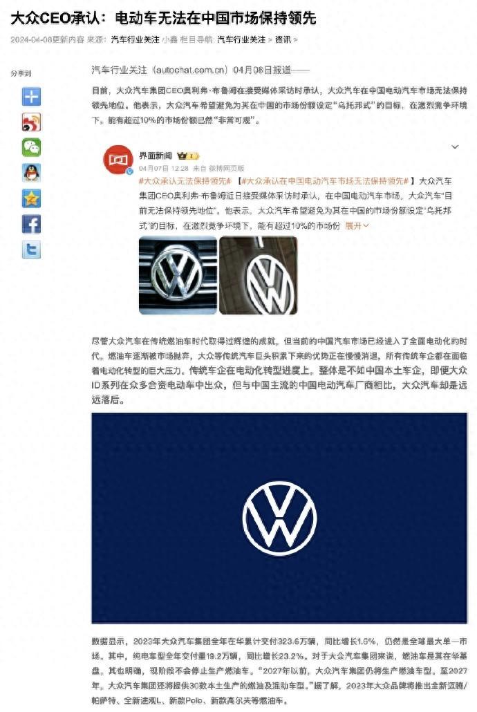 大众ceo向媒体承认,在中国电动汽车市场,大众汽车“目前无法保持领先地位”