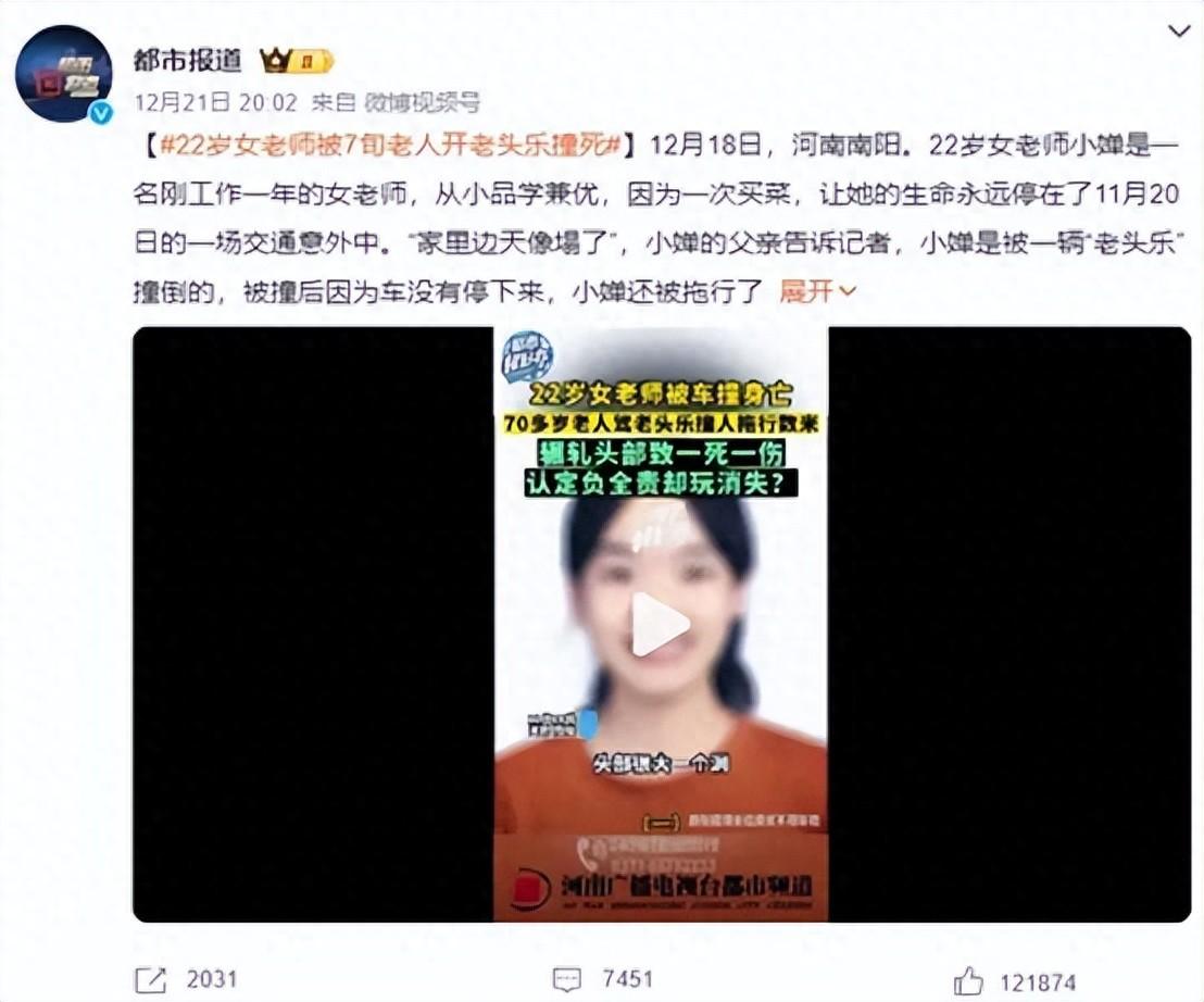 像去年12月份的一起事故,一名年仅22岁的女教师,被一辆老年代步车撞死以后,因为对方年过70,代步车又没有任何保险,导致这位女教师家属几乎没有伸冤的可能。