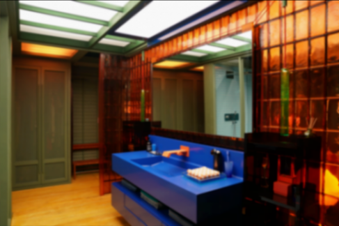卧室的基调是暖橘色的,我们希望秦奋休息的空间是温暖的,他的床头还挂着秦奋和笑笑第一次结伴出国在北海道拍的合影。秦奋的床铺则是以深蓝色为主,想表达他自己一个人躺在床上的时候是孤独的、忧郁的——这里面其实安排了一对正背关系——秦奋的卧室和主卫做了半开放式的隔断,用一面橙色的玻璃墙隔开,一边是蓝色的床铺,另一边则是同样蓝色的盥洗台,因为他在等待笑笑的10年间起居都是一个人,在盥洗台对着镜子洗漱时只能看到自己,同样也是孤独的。