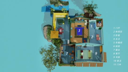 方案一开始我们也仅是从构成上去做色彩的搭配,而空间色彩的视觉感受每个人都不一样,主观性极强,很难绝对说什么样的配色是对的。最后我们把秦奋的角色性格引进设计中,从秦奋的主观出发,去想象每一面墙、每件家具软装的色彩搭配。