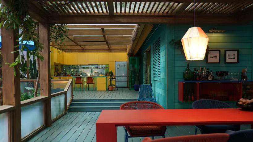 厨房连通露台,红色的餐桌分外显眼