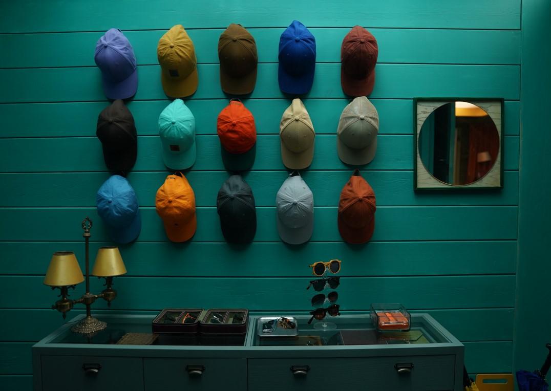 除了这两面墙外,门口玄关处的帽子墙是导演特别精妙的创意。在思考这面墙如何设计时我特别苦恼,进门挂什么装饰画都觉得别扭,空着更不合适,导演就建议这里可以挂一墙帽子。秦奋是个光头,他所在的海岛日光特别强烈,电影中他只要外出都会戴帽子,这是非常合情合理的。