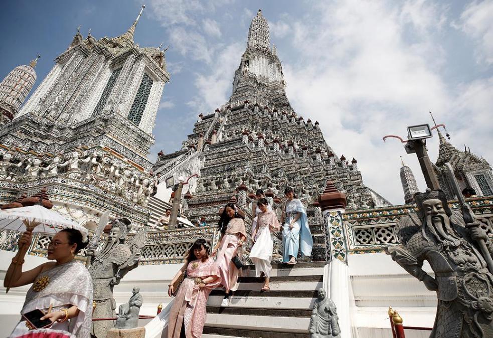 当地时间2023年12月29日,泰国曼谷,游客身穿传统服装游览寺庙。
