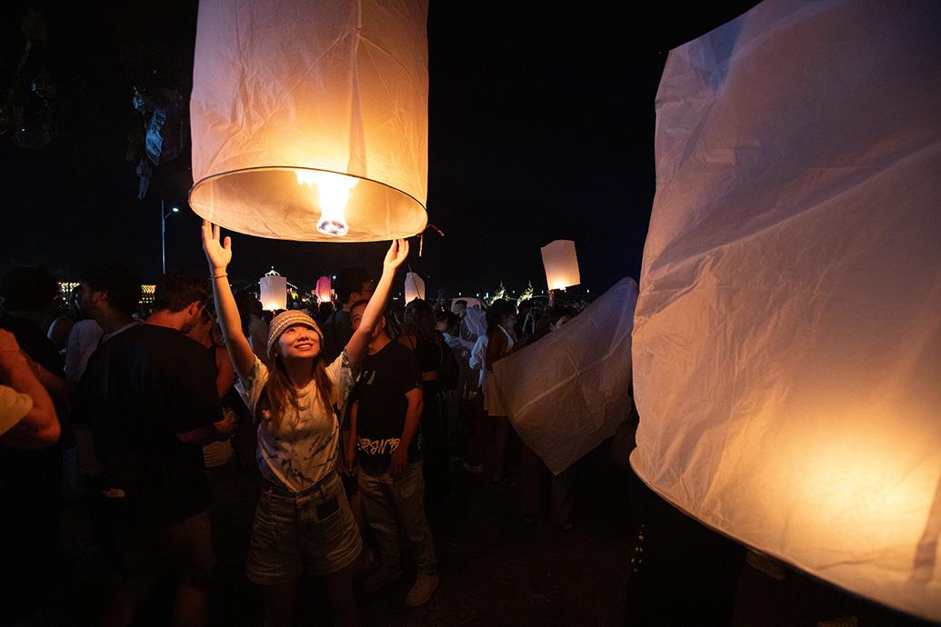 当地时间2023年11月27日,泰国清迈,人们在水灯节期间放灯笼。