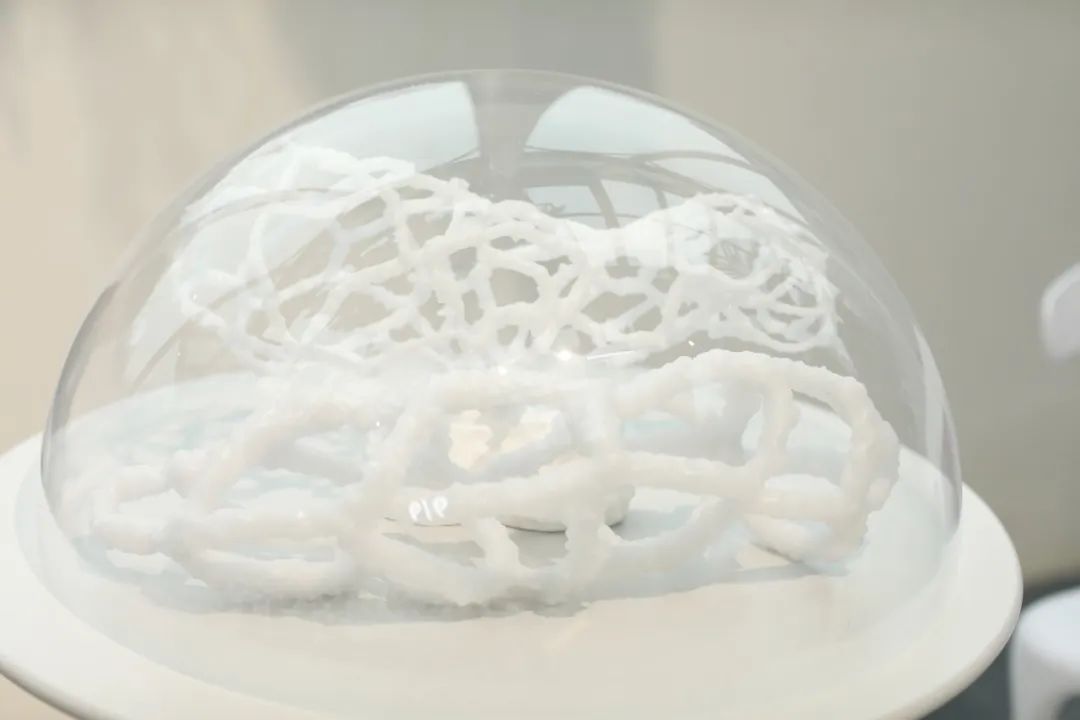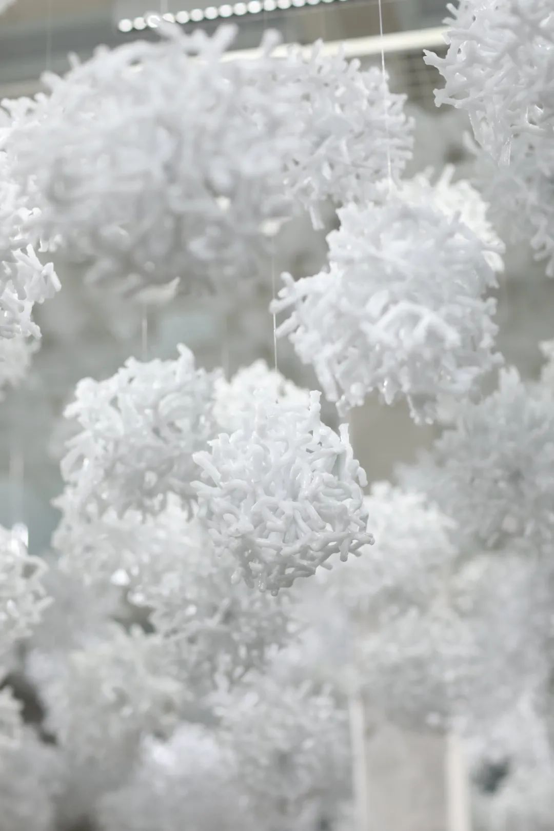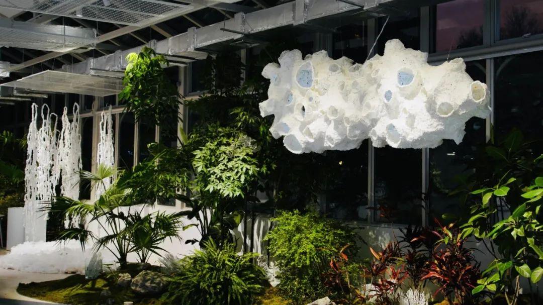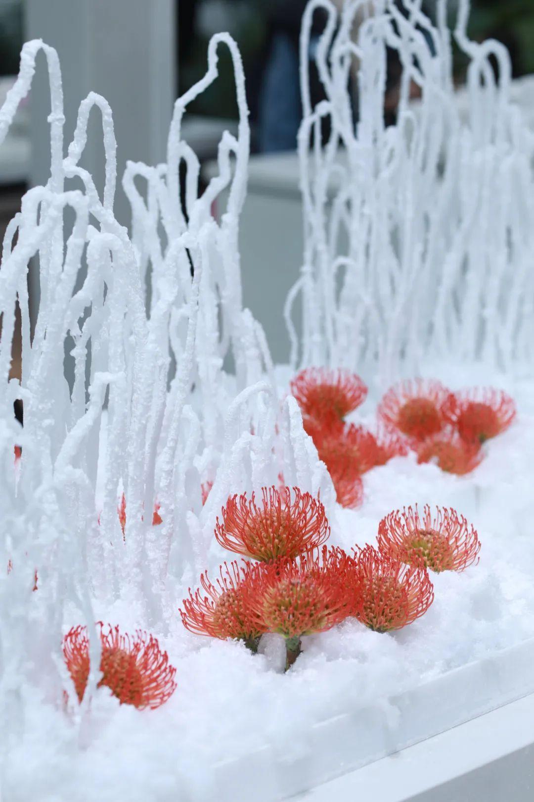 据介绍,这片“冰雪世界”是园艺中心专门打造的“剪云雕雪——冰雪装置艺术展”,由擅长白云艺术的装置艺术家谢志峰呈现。展览由大型装置和小品雕塑组成,共有十个作品,包括《剪云雕雪》《冰泪雪墙》《冰川火海》《蓬山异卉》《雪光云堡》《白化珊瑚》《梦幻泡影》《梅立寒冰》《雪凝时刻》和《表白雪墙》。这些作品呈现了一个超现实的“冰雪云梦世界”,每件作品都有独特的主题和灵感来源。艺术家们通过使用石蜡、尿素、仿真珊瑚等非传统材料,呈现出了雪花、泪墙、冰川、仙境、堡垒、珊瑚和梦幻泡影等自然和人造景观。