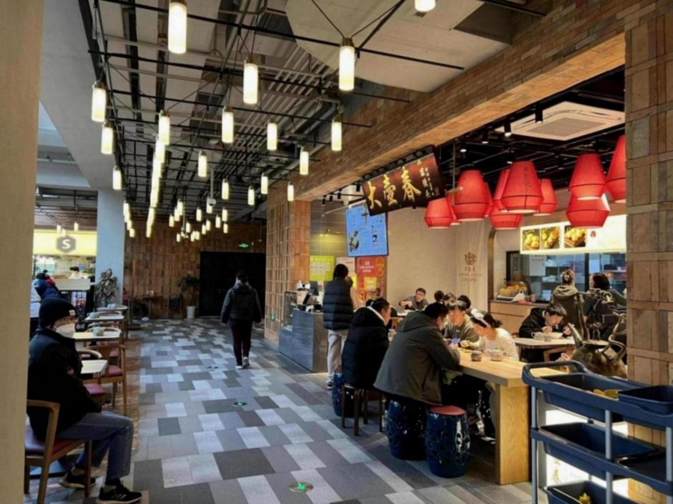 尽管是工作日下午2点多,鸿寿坊商圈仍然人气满满,陆续有人来打卡拍照,一些门店如大壶春店里甚至还坐满了食客,食集里一家家生鲜店、老字号等店铺内,陆续有周边社区居民前来购物,广场中央也有居民们遛着狗、晒着太阳。