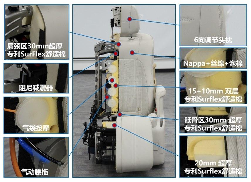 别克gl8插混版将提供nappa真皮材质包覆的座椅,座椅的坐垫和椅背看起来颇为宽厚,座椅内部使用surflex舒适棉填充,局部区域厚度可达到30毫米。同时,别克gl8插混版的座椅还集成气袋按摩、气动腰托、阻尼减震器等功能配置,为乘坐舒适性提供保障。