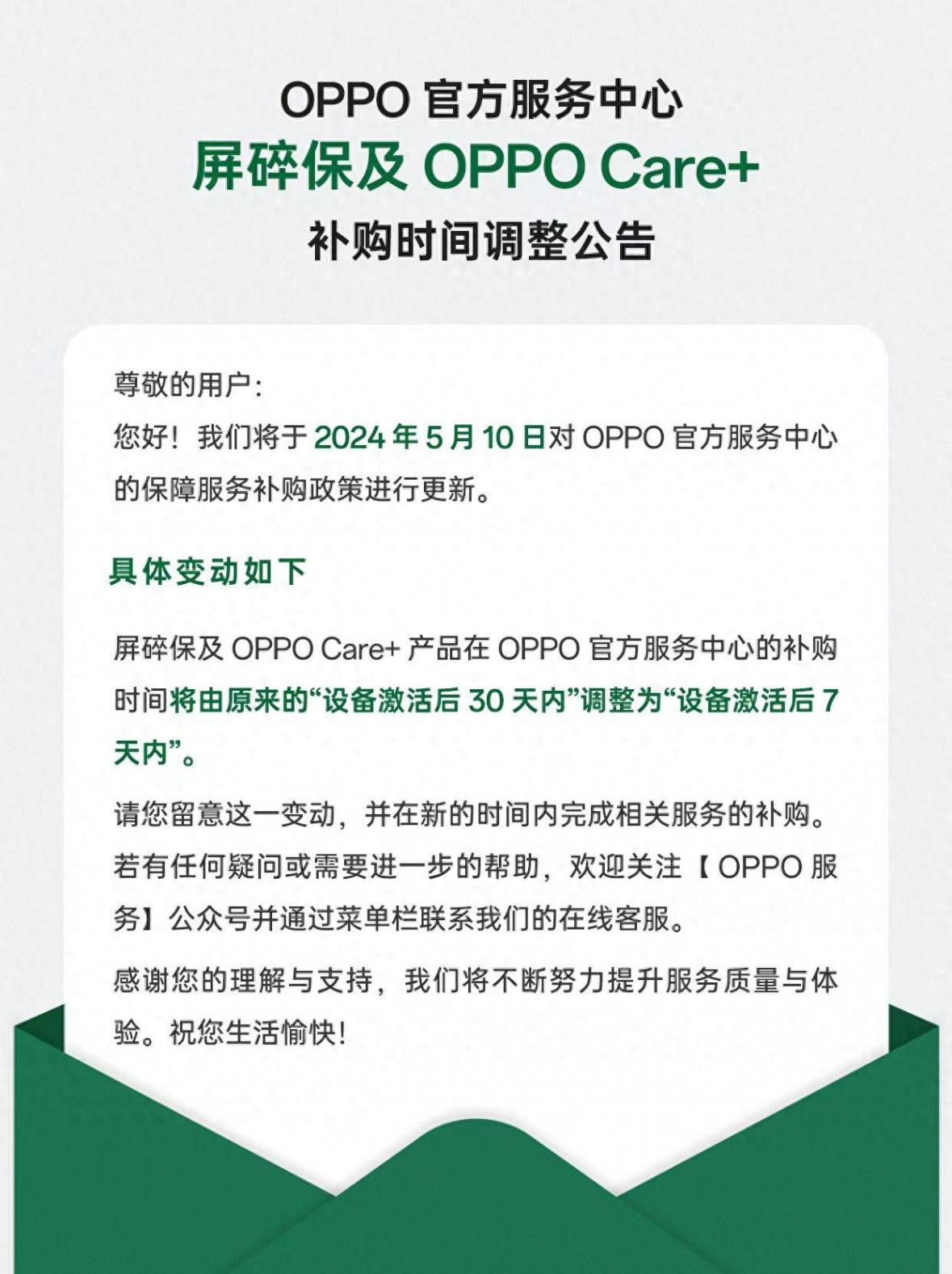 4 月 15 日消息,oppo 宣布调整官方服务中心屏碎保及 oppo care 补购时间,由“设备激活后 30 天内”调整为“设备激活后 7 天内”,5 月 10 日起更新政策。