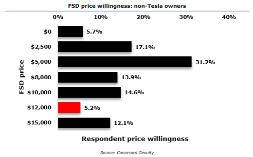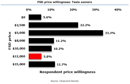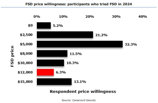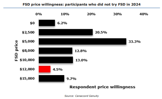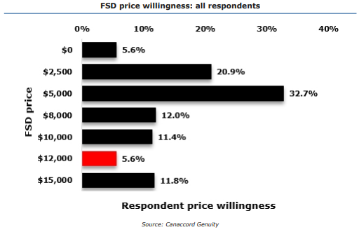 数据还显示,超过一半的受访者的心理价位在2500美元和5000美元两个档次,不及fsd当前定价的一半。