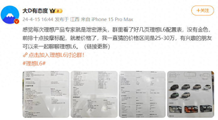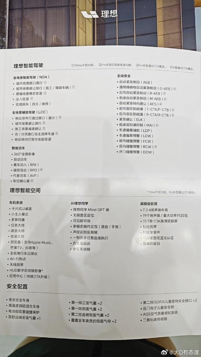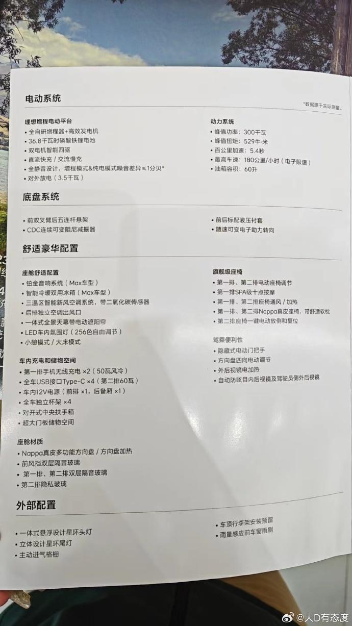 4 月 15 日消息,理想 l6 车型将于 4 月 18 日上市。在此之前,博主 @大 d 有态度 在微博分享了理想 l6 车型的产品页,只差价格还未公布。