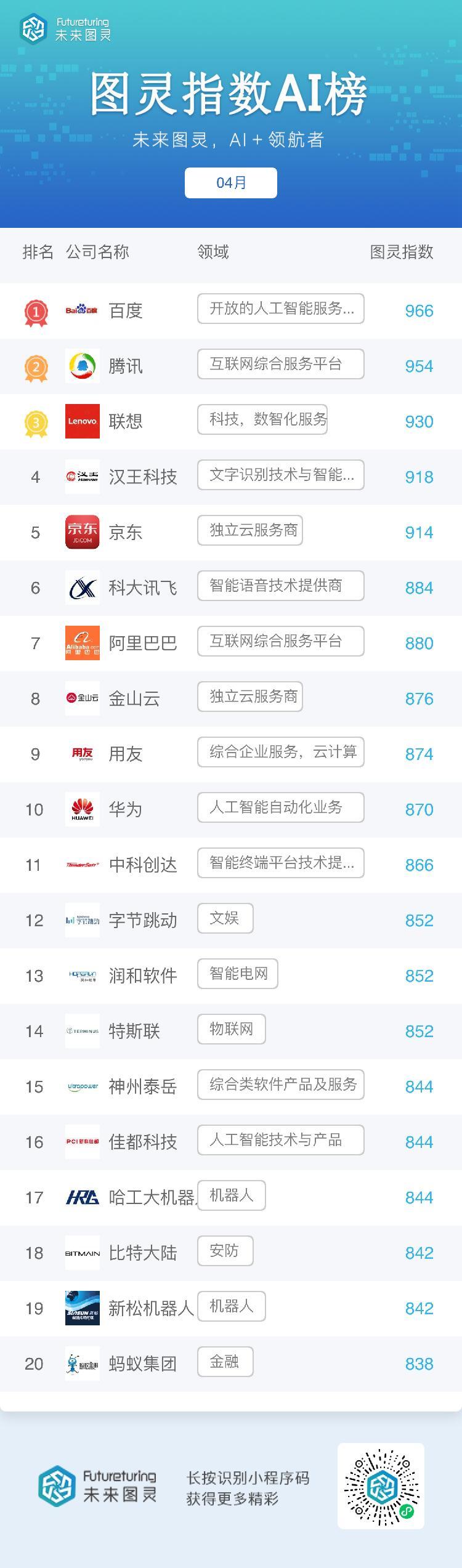 近日,未来图灵与大众网·海报新闻联合发布ai明星企业4月榜单。在本月榜单中,百度、腾讯位居前2名,联想由上月第5名升至本月第3名。