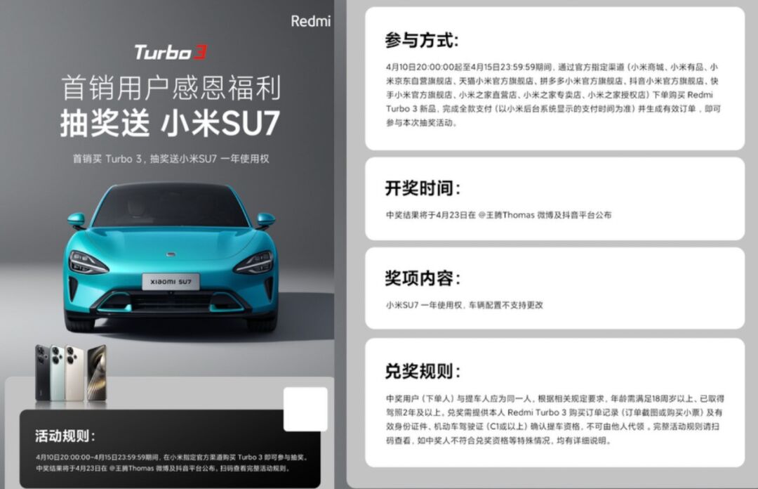 另外王腾还宣布turbo 3 首销目标达成,为了回馈首销用户的支持,会在4月23日抽取一位幸运首销用户,送出雷总奖励给团队的小米su7一年使用权,具体活动细则见图片,可参与小米su7汽车使用权的为4月10日-4月15日23:59分期间下单redmi tubro 3的用户。有购买这台手机的