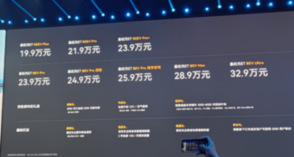 4月15日,星纪元et预售发布会在北京举行。本次星纪元et共提供纯电版与增程版两种,分别是reev系列:plus 19.9万元、pro 21.9万元、pro 23.9万元,以及bev系列:pro 23.9万元、pro四驱 24.9万元、pro城市智驾 25.9万元、max 28.9万元、ultra 32.9万元。