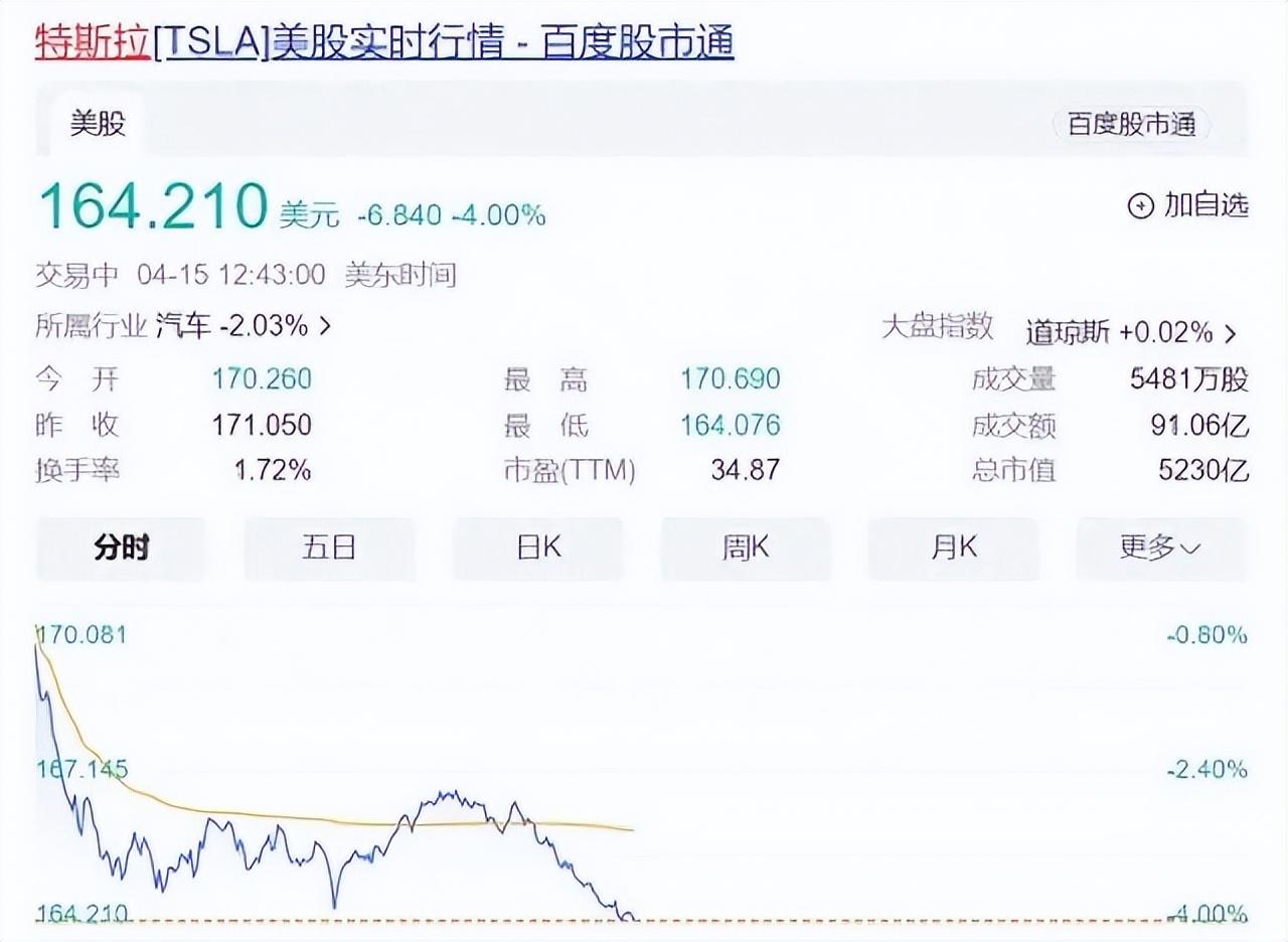 4月以来,特斯拉的股价一直比较难看,4月15日的股价更是跌到164美元,下跌幅度接近5.6%,305亿美元(2214亿人民币)的市值烟消云散。