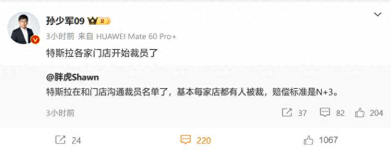 4 月 16 日消息,汽车博主 @孙少军 09 、@胖虎 shawn 今日声称,特斯拉已开始与门店沟通裁员名单,赔偿标准为 n 3,“基本每家店都有人被裁”。