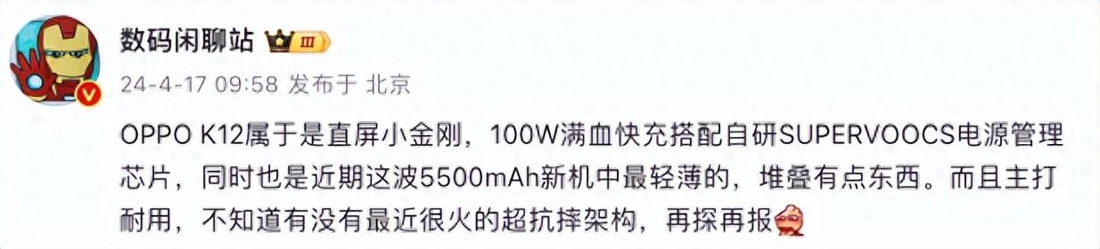 4月17日,数码闲聊站再曝出有关该新机的信息,表示oppo k12是直屏小金刚,拥有100w满血快充和自研supervoocs电源管理芯片。更重要的是在此基础上,oppo k12还可能兼具轻薄与大电池,博主表示它可能是近期这波5500mah新机中最轻薄的,堆叠有点东西。