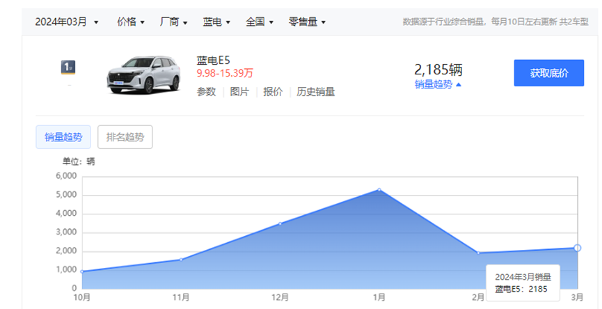 据统计,蓝电e5在2024年3月零售量仅2185辆,和2月份淡季的1915辆的零售量相比仅有200余辆的攀升,而和1月份的巅峰5289辆相比则仍然呈现下滑态势。事实上,本以为随着问界m7的火爆,在溢出效应的加持下蓝电e5在2024年将有所起色,但从近两月销量表现来看,蓝电e5的表现显然不够给力。