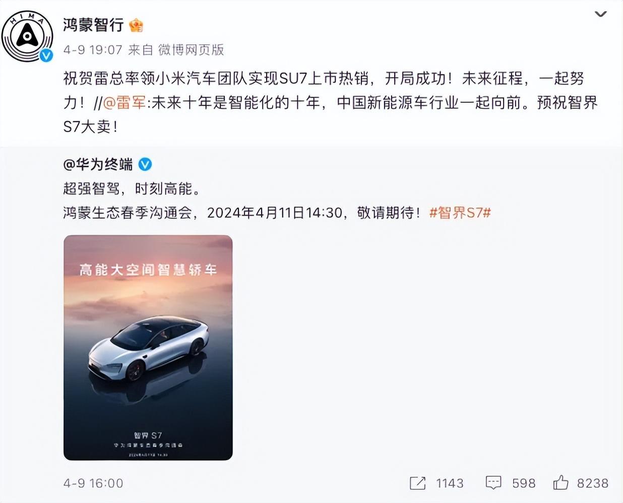 在发布会前,就连雷军也发微博,预祝智界 s7 大卖。