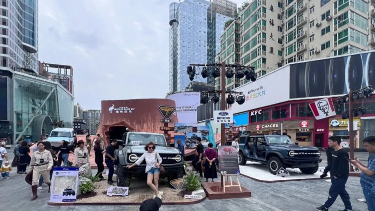 春熙路步行街中央,牛仔帽造型的烈马营地如同一座矗立的雕塑,数辆烈马bronco停放在“帽檐”周围,引得路人驻足围观、打卡合影。