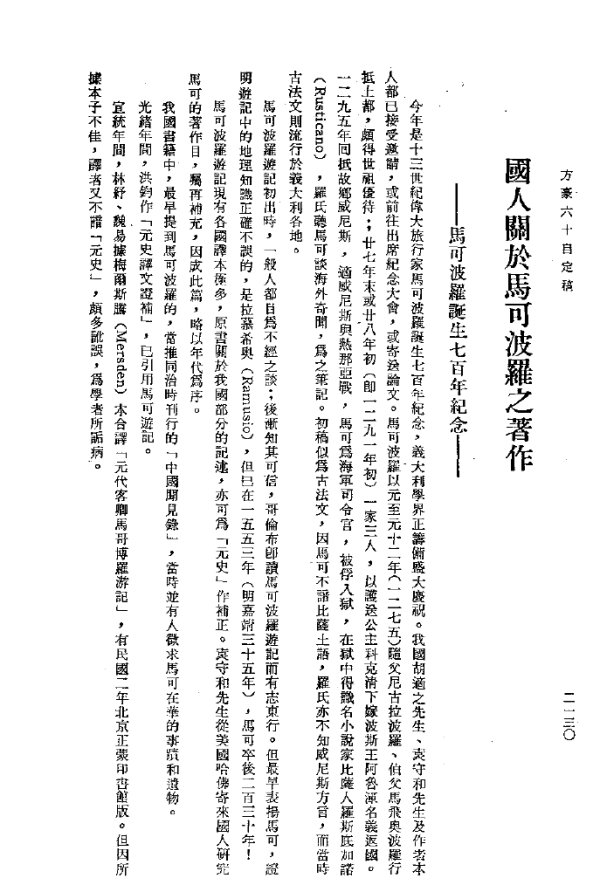 十八年,《东方杂志》二十六卷十期,有向达著《元代马可孛罗诸外国人所见之杭州》。同年,《辅仁学誌》一卷二号,载姚从吾译《蒙古史发凡》,其第二篇第六节为《孛罗父子之旅行》。