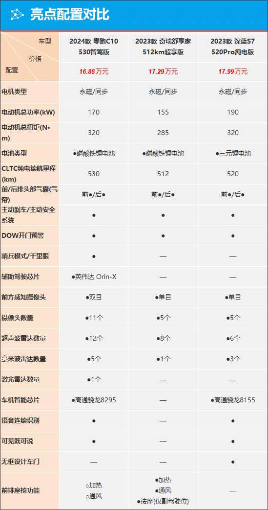 配置对比环节,尽可能选取三款价格相近的车型进行对比,其中零跑c10和奇瑞舒享家均为顶配车型,而深蓝s7纯电版由于定价相对较高,只能选择入门版车型。从配置对比中不难看出,深蓝s7虽然价格更高,但整体配置表现相比其他两款车型并不占有太大优势,但好在电动机总功率较大,拥有更好的加速体验,并且采用了无框设计车门,开门时非常酷炫。零跑c10和奇瑞舒享家的价格相近,奇瑞舒享家胜在舒适性配置,例如搭载了前排座椅通风/加热和按摩(仅副驾驶位),乘坐体验更佳。不过零跑c10可以选装前排座椅通风和加热,并且配有丰富的主/被动安全配置以及智能化配置,例如哨兵模式/千里眼、128 线程激光雷达、英伟达 orin-x 智驾芯片等,售价也是三款车型中最低的。综合来看,三款车型中,零跑c10在配置层面占据了明显优势。