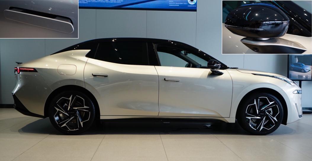 侧面造型同样颇有看点,车身比例协调,轴距适中,前悬较短、后悬较长,高度较低。黑色车顶在c柱前平直、c柱后快速下滑,形成很有特色的溜背感。车身腰线在后门把手处快速上扬,与回钩造型的c柱融合,并有显著的向内向后收缩的趋势,优化空气动力学效果。四个车门都是无框门,后窗采用很深的隐私玻璃。采用与领克08相同的flush door车窗,玻璃与立柱位于同一平面,让侧面十分整洁,不仅显高级还能降低风噪。外后视镜底座造型很有设计感,集成侧摄像头,全黑色外壳集成侧转灯,提供与领克08相同的满框式后视镜玻璃,有高级感。门把手为整体隐藏弹出式,驾驶位带无钥匙进入。
