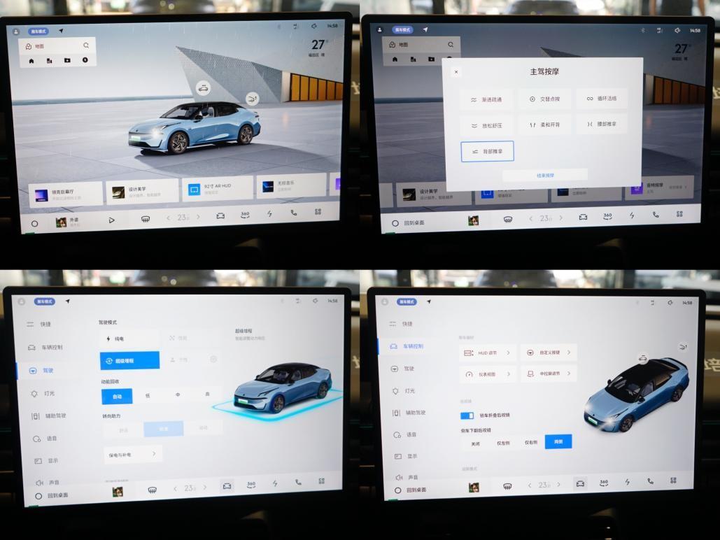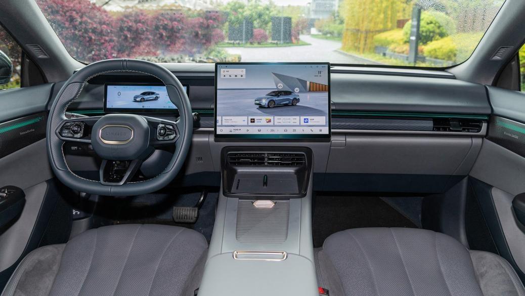 15.4英寸外挂式中控屏边框较窄,分辨率达到2.5k,flyme auto车机集成化程度很高,所有硬件都可以通过屏幕控制,包括方向盘、外后视镜、天窗、尾门等,实现可见即可说。提供三种桌面,还可自定义,应用中心可下载软件。桌面支持smart bar功能,任意一功能卡片可放大缩小与拖动,与手机体验接近。比较有特色是巨幕厅功能,把23个喇叭的哈曼卡顿音响系统、氛围灯、座椅按摩功能联动起来,观看影片时氛围灯会呼吸式变化、座椅有震动感、空调会根据剧情出风,音响有环绕效果,体验很超前。车机与手机也能实现无缝切换和信息转换,十分便利。