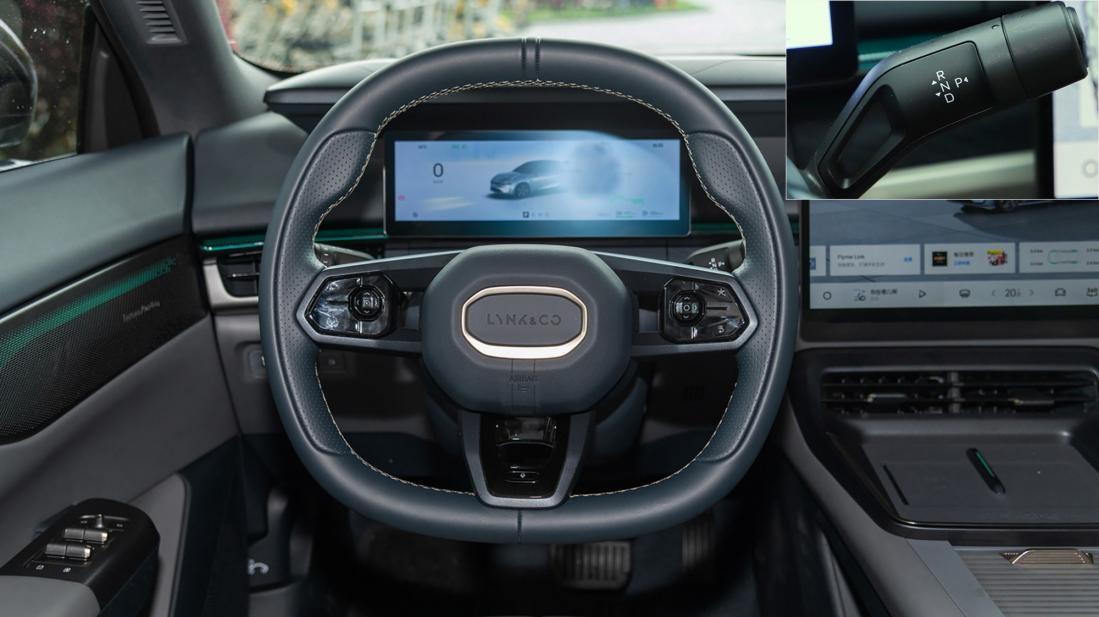 三辐方向盘与领克08相同,上半环较大,便于观看仪表屏。真皮材质触感舒适饱满,尺寸合适。两侧皮面增加打孔,内衬有缝线。横辐上的多功能控制区按键,增加4向按键,用起来比较顺手,左侧控制l2级驾驶辅助系统,将语音按键布置在下方条幅,也很特别。右后方布置了怀挡式电子挡位,可实现无感式上车。
