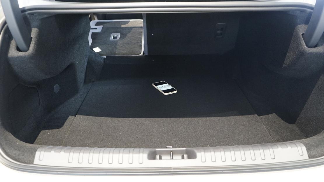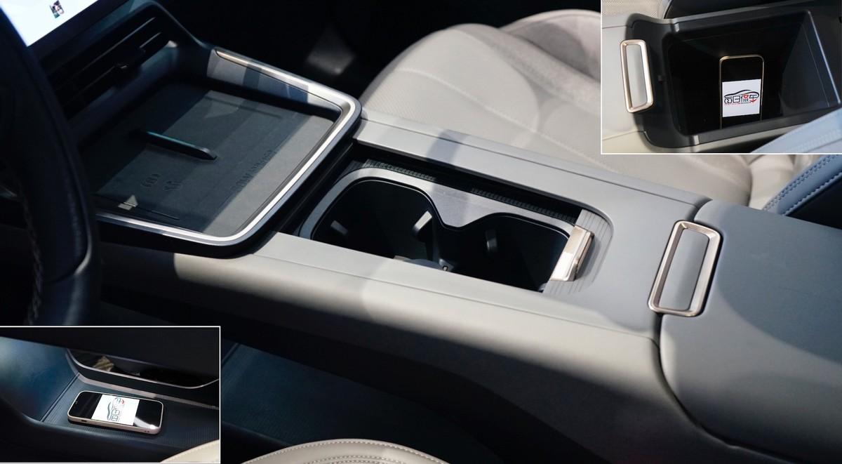 扶手台成为纯粹的储物空间,前方双手机格左侧带50w无线快充,麂皮材质有防滑效果。滑盖下方是双杯架,后方扶手箱的容积不算大,但下方悬浮空间高度与长度都比较可观,能放置不少物品。