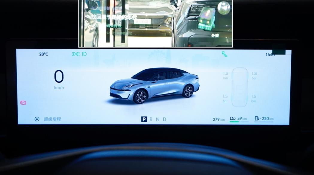 12.3英寸全液晶仪表屏宽度增加、高度降低,三区展示简单清晰,中央主要显示驾驶辅助信息,左侧为行车信息,右侧为电脑信息。92英寸的ar-hud抬头显示尺寸很大,投射距离达到10米,视线可以拉的比较远,导航指示与实景的融合度做得很好,停车时还能将投射视频,变成观影屏。