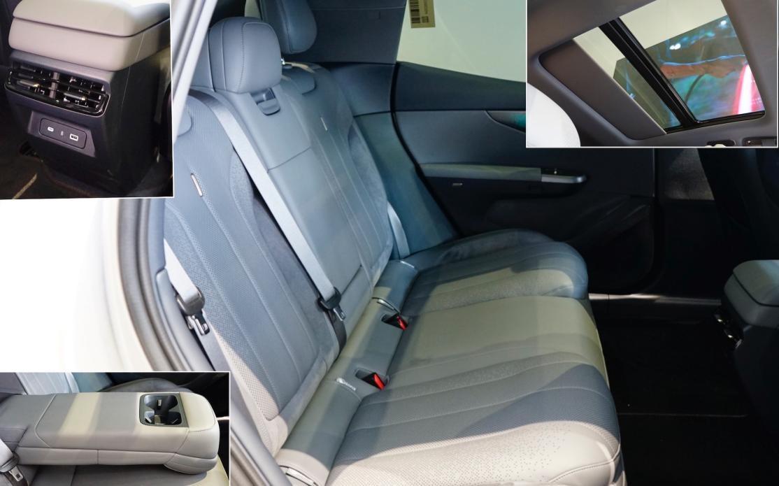 后排座椅长度一般,但采用夸张的加厚处理,保证腿部承托性足够。靠背倾斜角度合适,有一定的侧向支撑,整体舒适感不错。空间方面,侃弟身高175cm,腿部接近3拳,头顶有一拳,横向乘坐三人轻松,地板为全平。配置上,车顶全景天窗面积不算大,带电动遮阳帘;地台出风口带双usb接口;中央扶手尺寸很大,靠起来很舒适,并带双杯架。