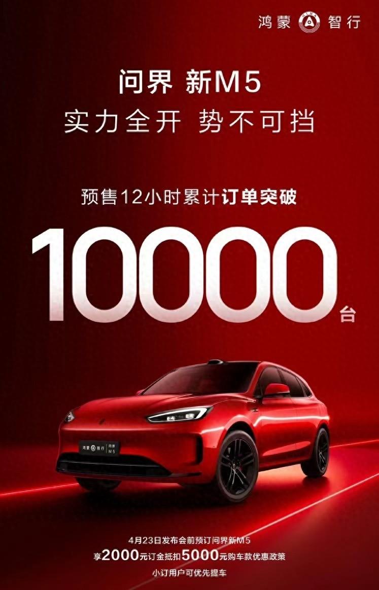 近日,根据鸿蒙智行官方数据,自4月17日上午开放预定通道后12小时,问界新m5累计订单已经突破1万台。按照规划,新车将于4月23日正式上市。在预售期间,用户于发布会前预定,即可享受2000元定金抵扣5000元车款的优惠政策。