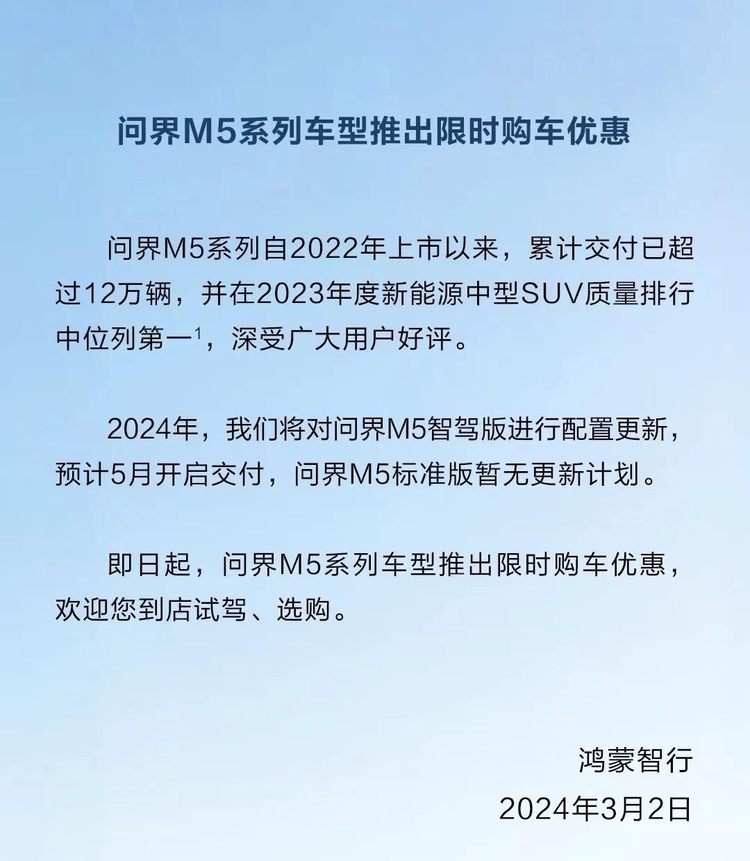 这也就是说,问界新m5主要是在现款智驾版的基础上进行升级。3月份,aito问界曾针对现款问界m5系列车型推出了限时购车优惠。其中标准版本的优惠权益包括赠送1.5万元科技舒享包以及1.2万元内外饰选配金。