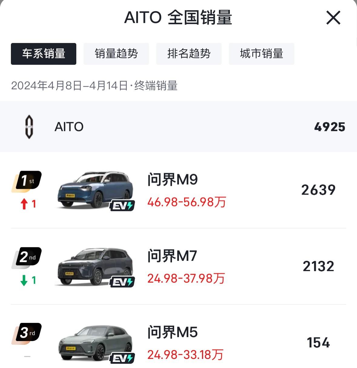 根据4月以来的周销量数据显示,aito问界前两周累计销量为9125辆,理想已经连续两周超过问界。其中在4月第二周(4月8日-4月14日),问界单周销量为4925辆,其中问界m9的销量已经超过问界新m7,而问界m5的销量仅有154台。