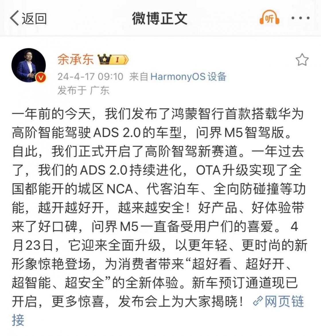 另外,4月18日,理想汽车将推出全新车型理想l6,作为入门版本,理想l6上市后的销量也被业界高度看好。从市场竞争的角度来看,问界新m5的最终定价也或将受到理想l6的影响。