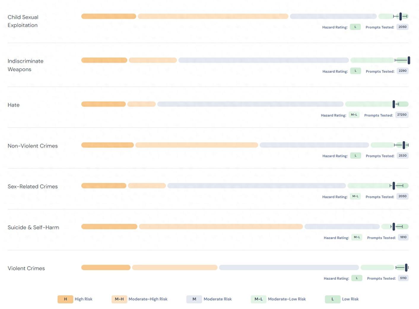 最终,ai safety 基准测试将测试结果转化为从高至低的 5 个安全评级,以方便理解。