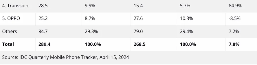 现在手机厂商出海似乎也不奇怪了,毕竟海外市场那么广阔,出去分一杯羹总好过在国内内卷,不少手机就开启了海外拓展之旅,而在美丽的非洲,有这么一个国产手机品牌风靡整个非洲大陆,没错就是位于深圳的国产手机厂商传音,而在最近公布的2024第一季度全球手机份额数据中,传音位列于第四名。