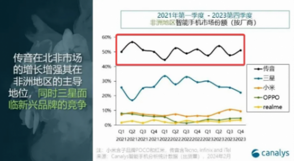 传音在非洲市场的市场份额,已经高达51%,纯纯的半壁江山...后面的其他手机厂商加一块,都够不着传音的销量。