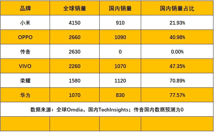可以看到,国内销量占比高的,在全球都排名不高,小米、oppo、传音国内销量占比低,则进入了全不过前五名。