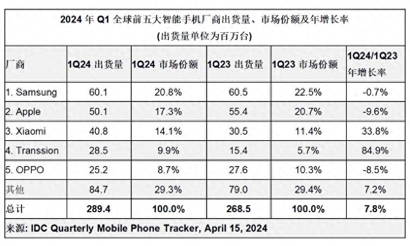 2024年一季度全球手机销量、以及中国手机市场数据出炉了。