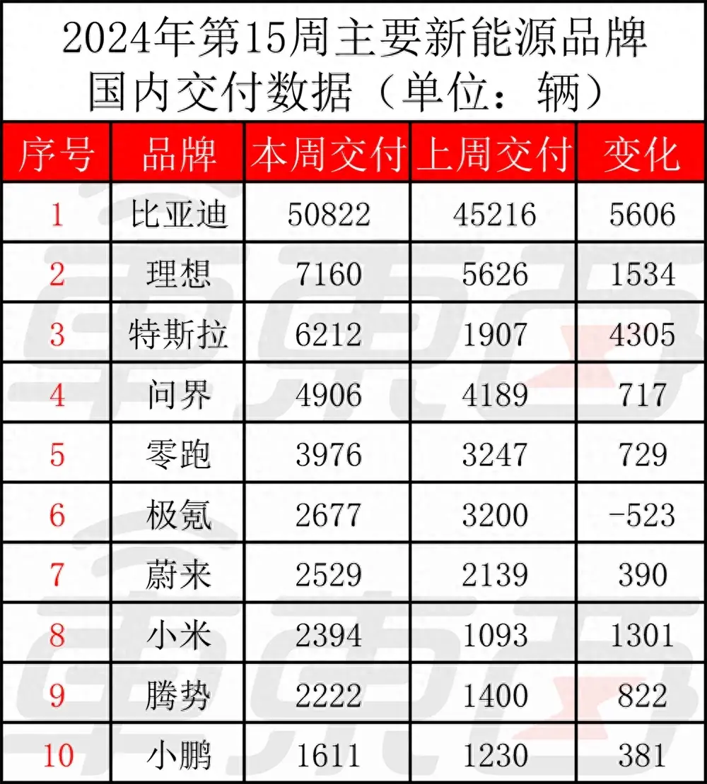 其中比亚迪遥遥领先,一周交付超过了5万辆,然后再是理想、特斯拉、问界、零跑、极氪、蔚来、小米、腾势、小鹏,这些品牌都没有过万。