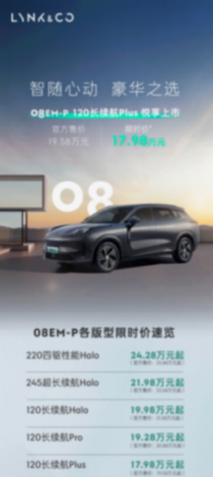 近日,领克08 em-p新增一款120长续航plus版车型,官方指导价为19.58万元,并且限时价17.98万元。该车cltc纯电续航里程达120公里,综合续航里程超1200公里。