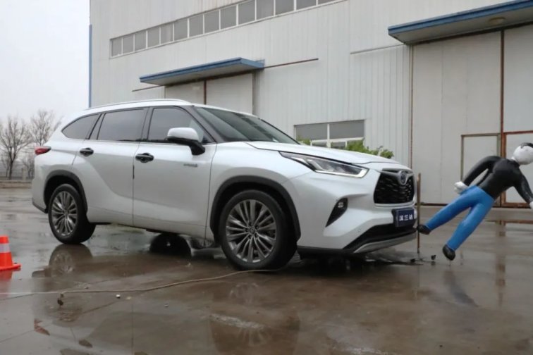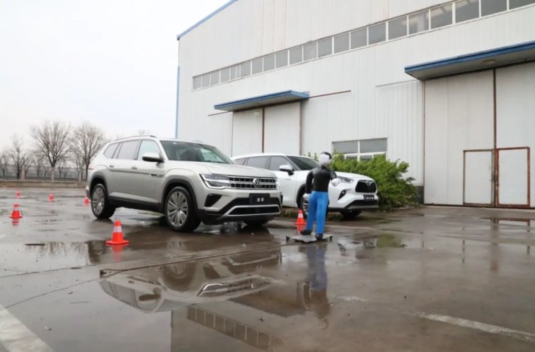 工作人员在测试场地主道路设置两台路边停靠的障碍车,测试假人从障碍车后窜出,分别驾驶测试车辆途昂和汉兰达以不超过40公里/小时撞向假人,看两台车aeb对假人的识别能力。