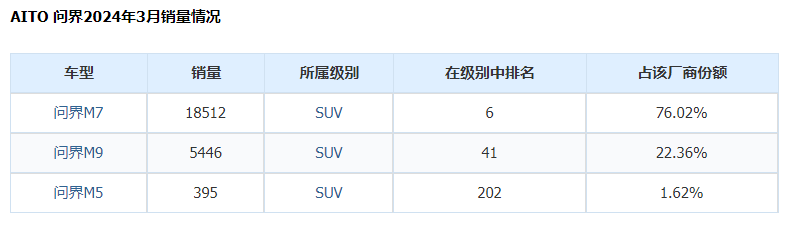 问界3月份销售31727辆,其中问界新m7在3月份销售24598辆,是单车型的销冠;问界m9交付6243辆,是50万以上豪车中自主品牌冠军。据悉,问界新m5增程版即将发布,采用了封闭式前脸,相比老款提升了9项配置,价格有望进一步下调。