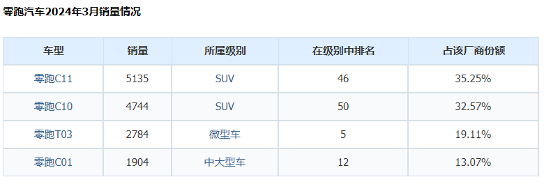 根据公布的3月交付成绩来看,2024年3月零跑汽车交付量为14567辆,同比增长超136%,而第一季度累计交付则达到了33410辆。单月销量大幅上涨主要得益于2024年度三款改款车型c11、c01和t03,以及全新车型c10的发布,主要是增程混动产品。