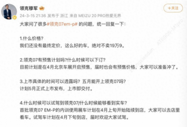 日前,我们从相关渠道了解,领克07 em-p将于北京车展预售!另外,我们还得知领克07 em-p计划在5月份正式上市。价格方面的话,领克穆军也表示,不会卖19万9。如果有感兴趣的小伙伴,可以借着今天的机会来提前了解一下新车的具体情况。