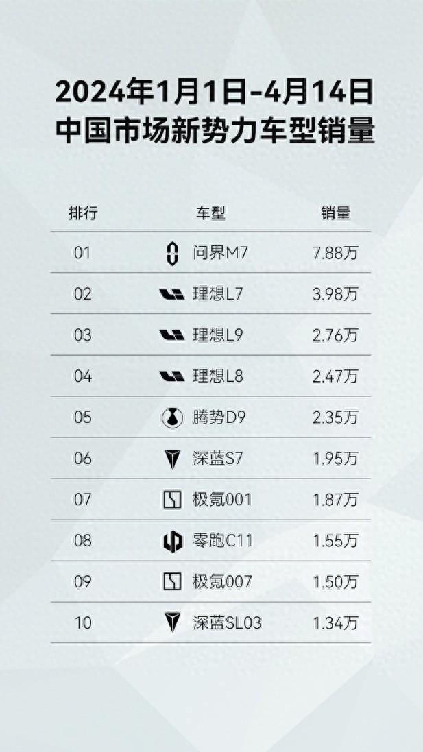 2024年3月的新车销量榜中,新势力品牌当中,问界以31727辆的新车交付量,蝉联冠军。其中问界新m7单月贡献最大,交付量达24598辆,再次封神。值得一提的是,2024年1月1日-4月14日中国市场新势力车型销量出炉,问界新m7持续占据榜首。