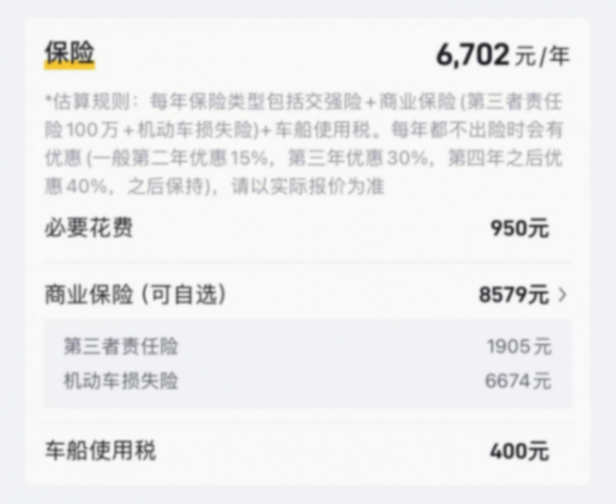 综上,第一年的保险费用总计为:交强险 车船税 商业保险=9929元。若每年无出险记录,保险费用会逐年递减,如第二年可享8.5折优惠,费用约为8440元;连续两年无出险,第三年保费打7折,费用约6950元;连续三年无出险,第四年保费6折,约5957元,并维持此折扣。
