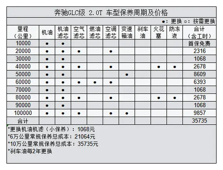 根据保养手册,车辆的首保里程为10000km,建议保养间隔为10000公里或12个月(以先到者为准)。6万公里内的保养项目及费用大致包括:机油、机油滤清器、空气滤清器、空调滤清器、燃油滤清器、变速箱油、火花塞、防冻液及一些常规检查,预计费用约为21064元。对于一台豪华中型suv,奔驰glc的保养费用还是比较可观的,且保养周期较长。